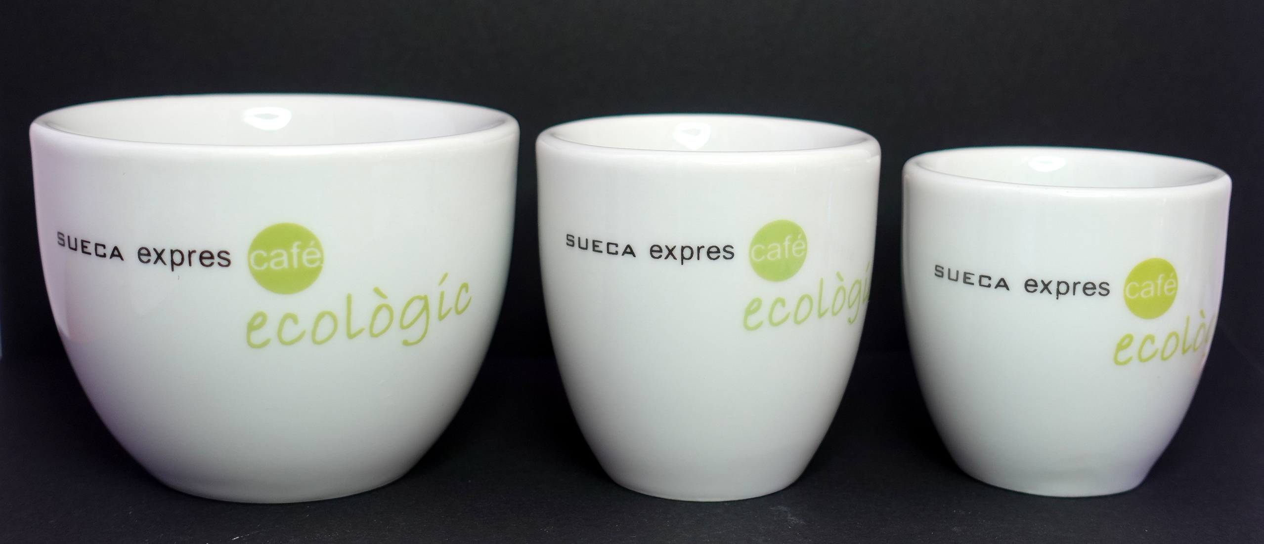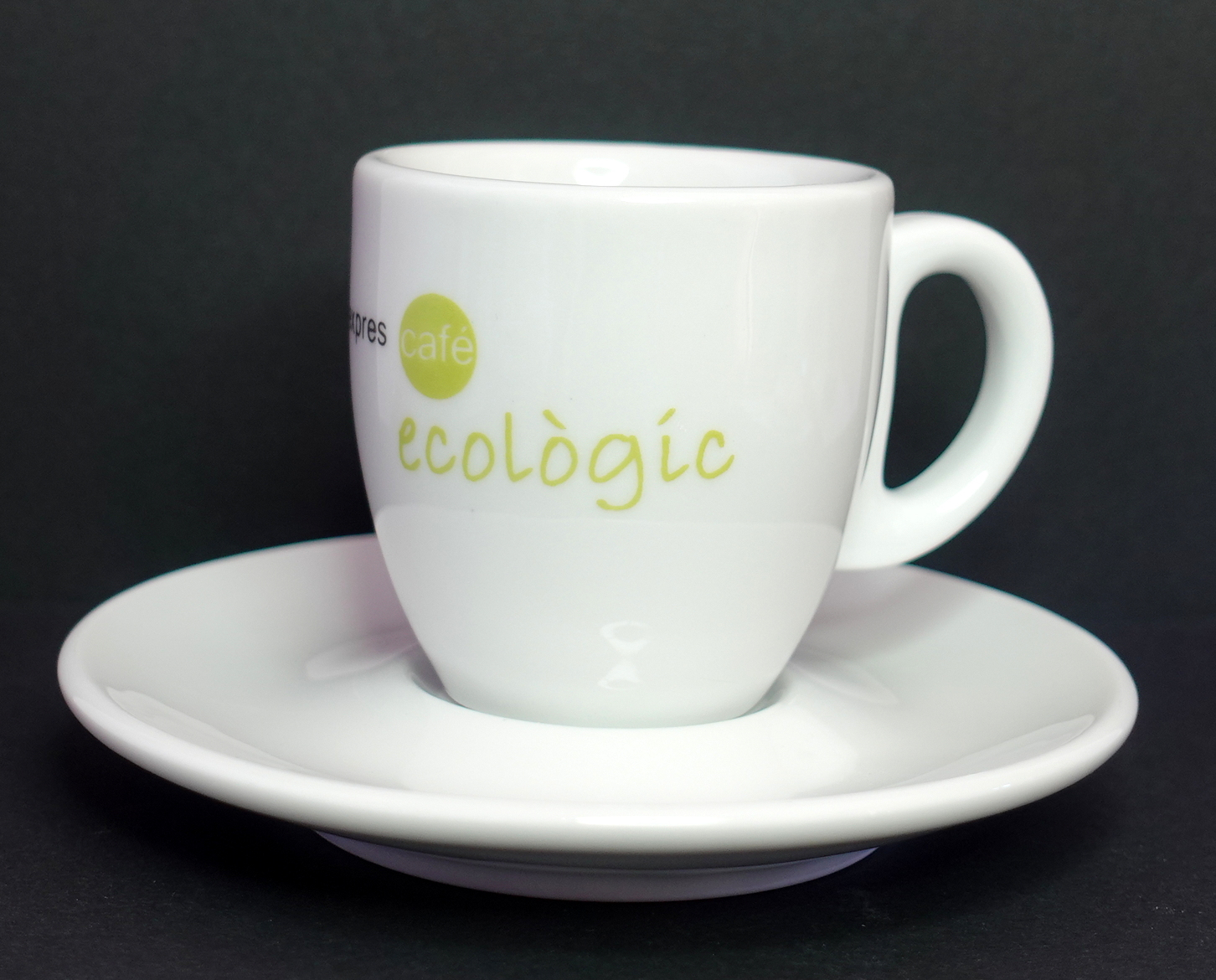 Taza y plato de porcelana. Con logo Ecològico de Sueca Expres Café.